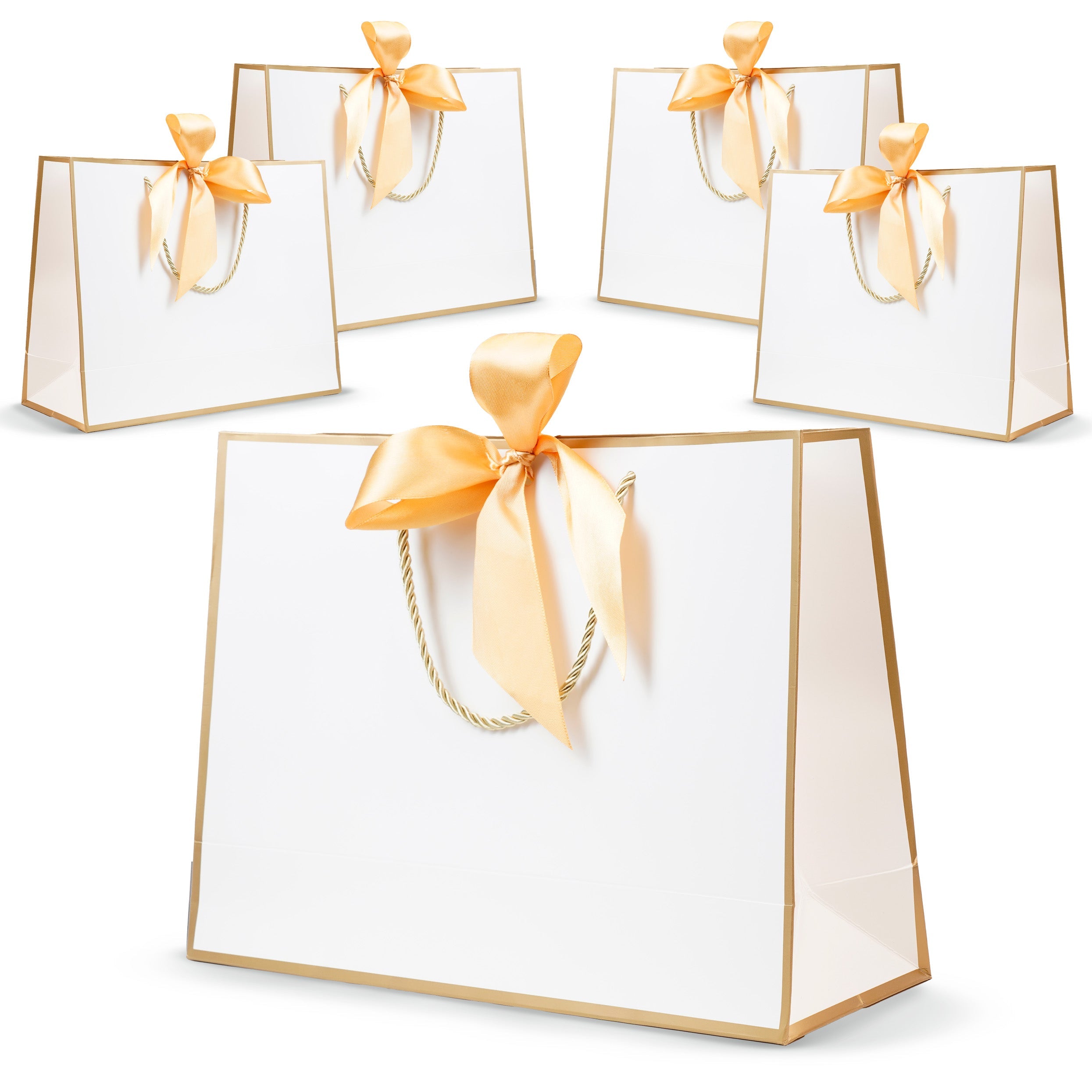 - Elegantes Set: Fünf klassisch weiße Weihnachtstüten aus Papier mit goldenen Akzenten.