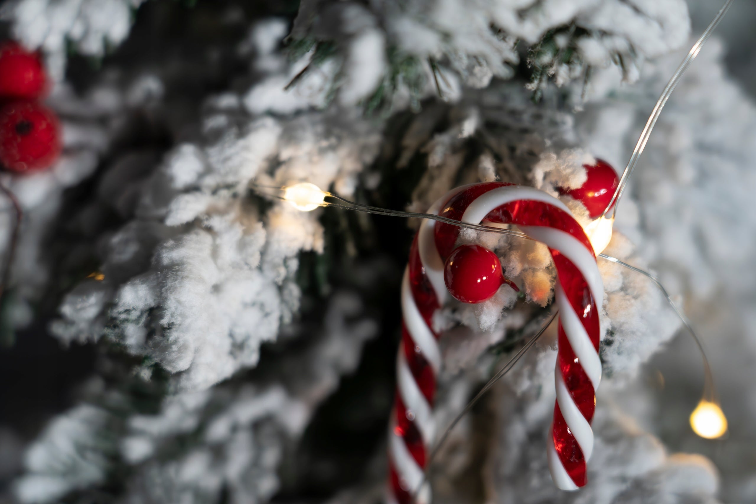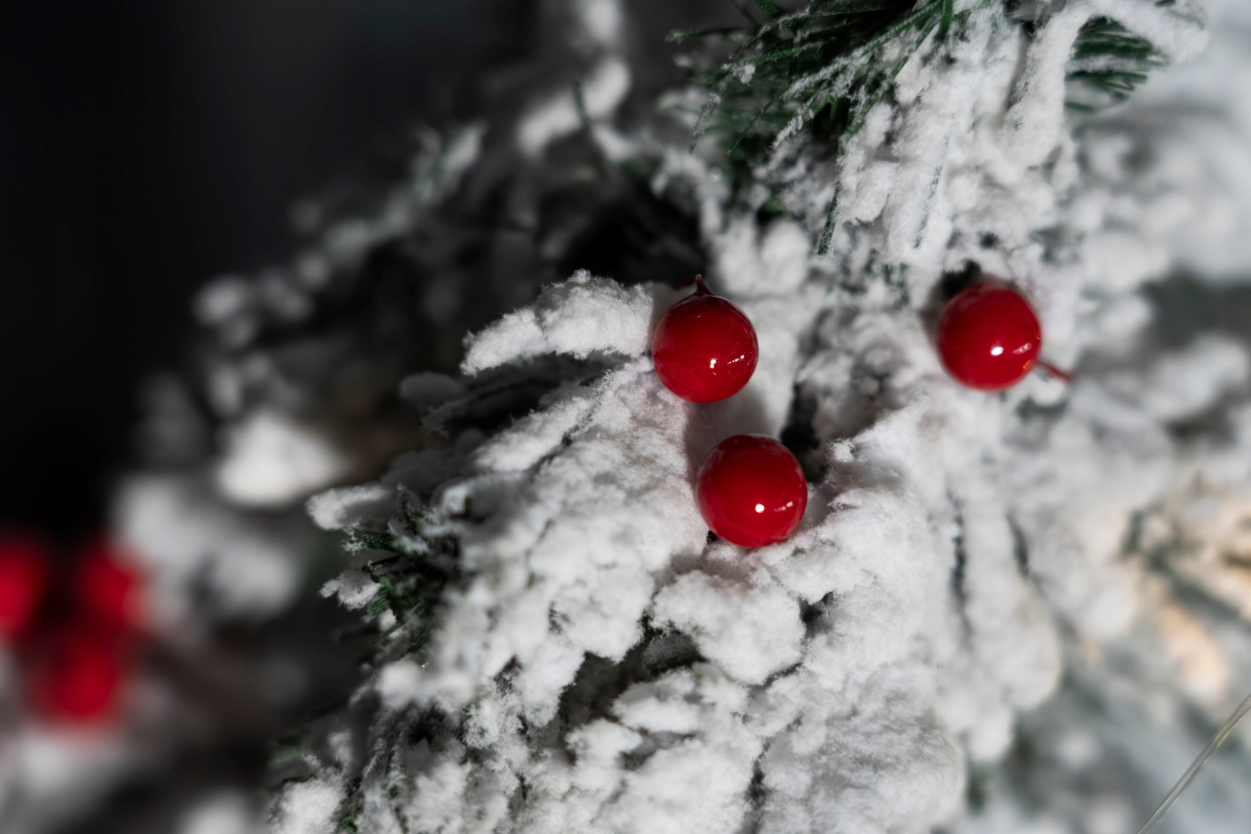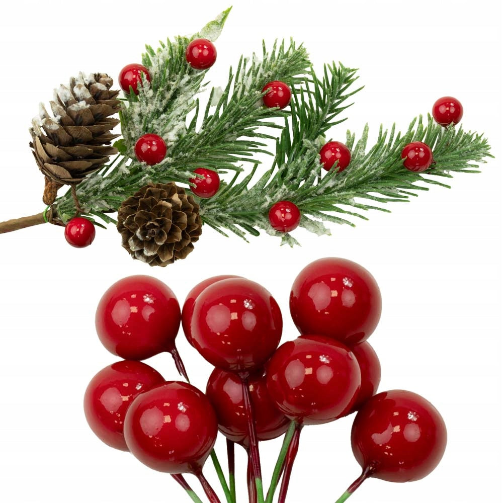 - Ein Set roter Kugeln auf einem Draht, die Ebereschenholz imitieren.