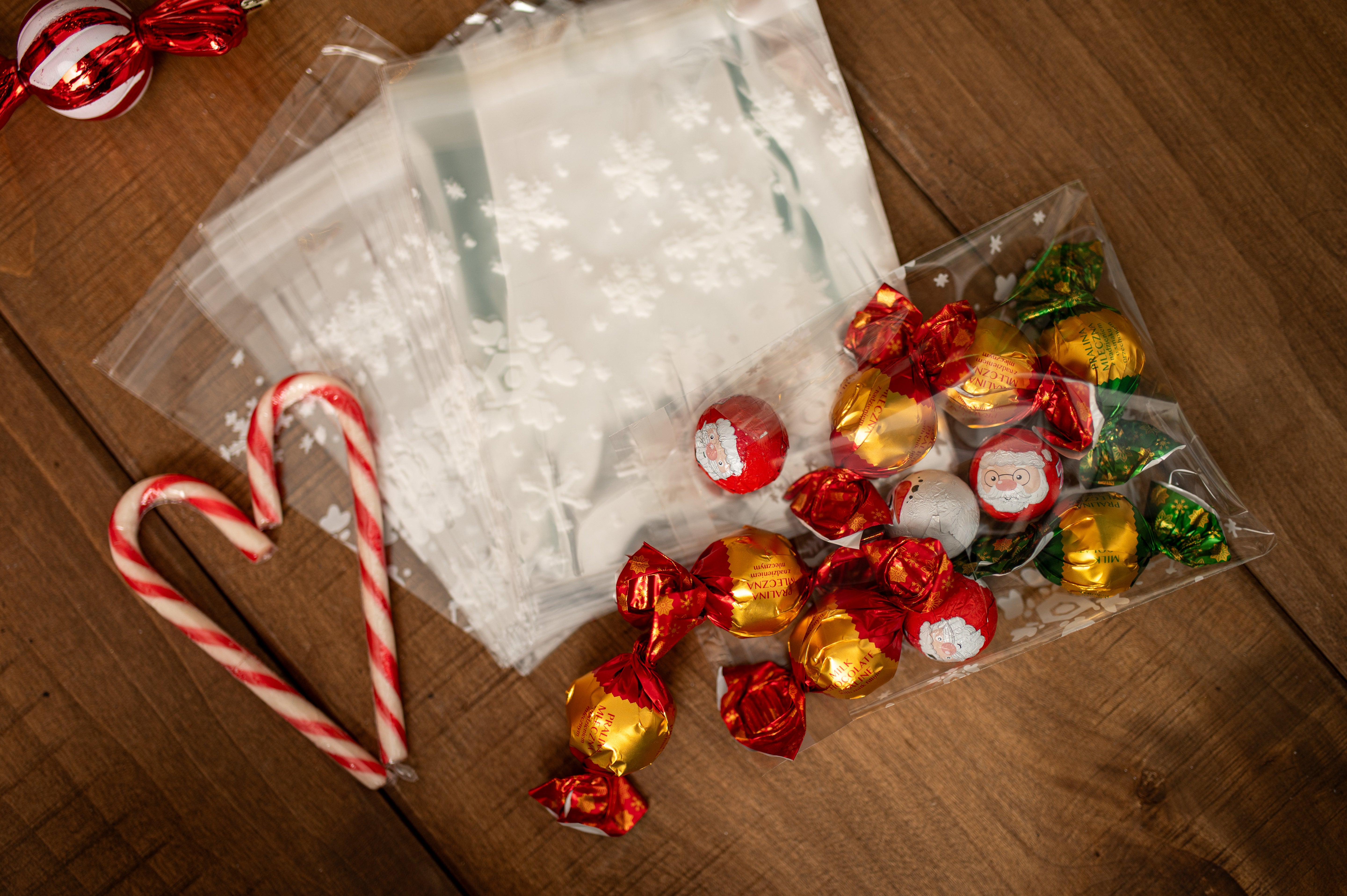 - Set mit 50 transparenten Zellophantüten mit zartem Schneeflockenmotiv, ideal zum Verpacken von Geschenken und Souvenirs, z. B. Weihnachtsgeschenken.