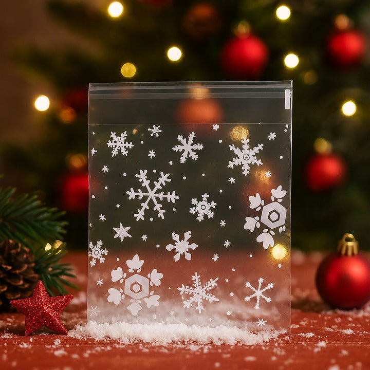 - Set mit 50 transparenten Zellophantüten mit zartem Schneeflockenmotiv, ideal zum Verpacken von Geschenken und Souvenirs, z. B. Weihnachtsgeschenken.