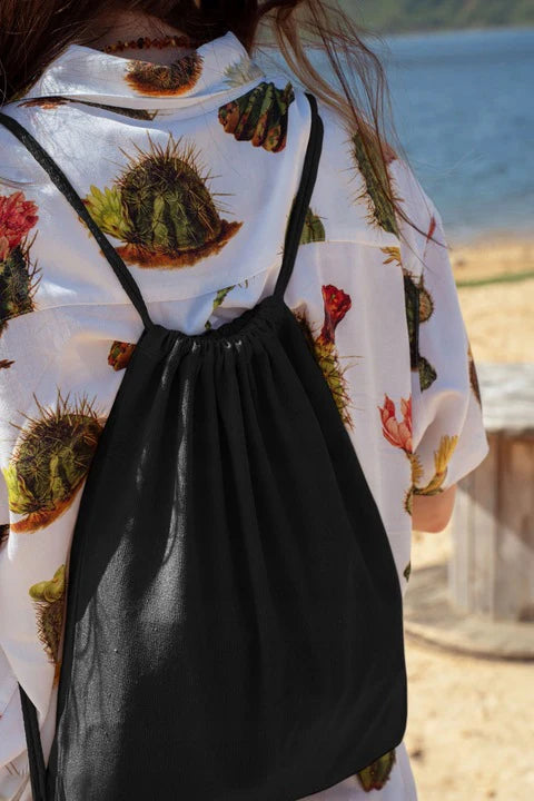 Praktisches Kordelsystem: Doppelte, innen eingenähte Schnüre dienen gleichzeitig als Schultergurte und als schneller Verschluss. Verstärkte Tunnel und Befestigungspunkte sorgen für Formstabilität und Alltagstauglichkeit ohne Ausdehnen des Materials.