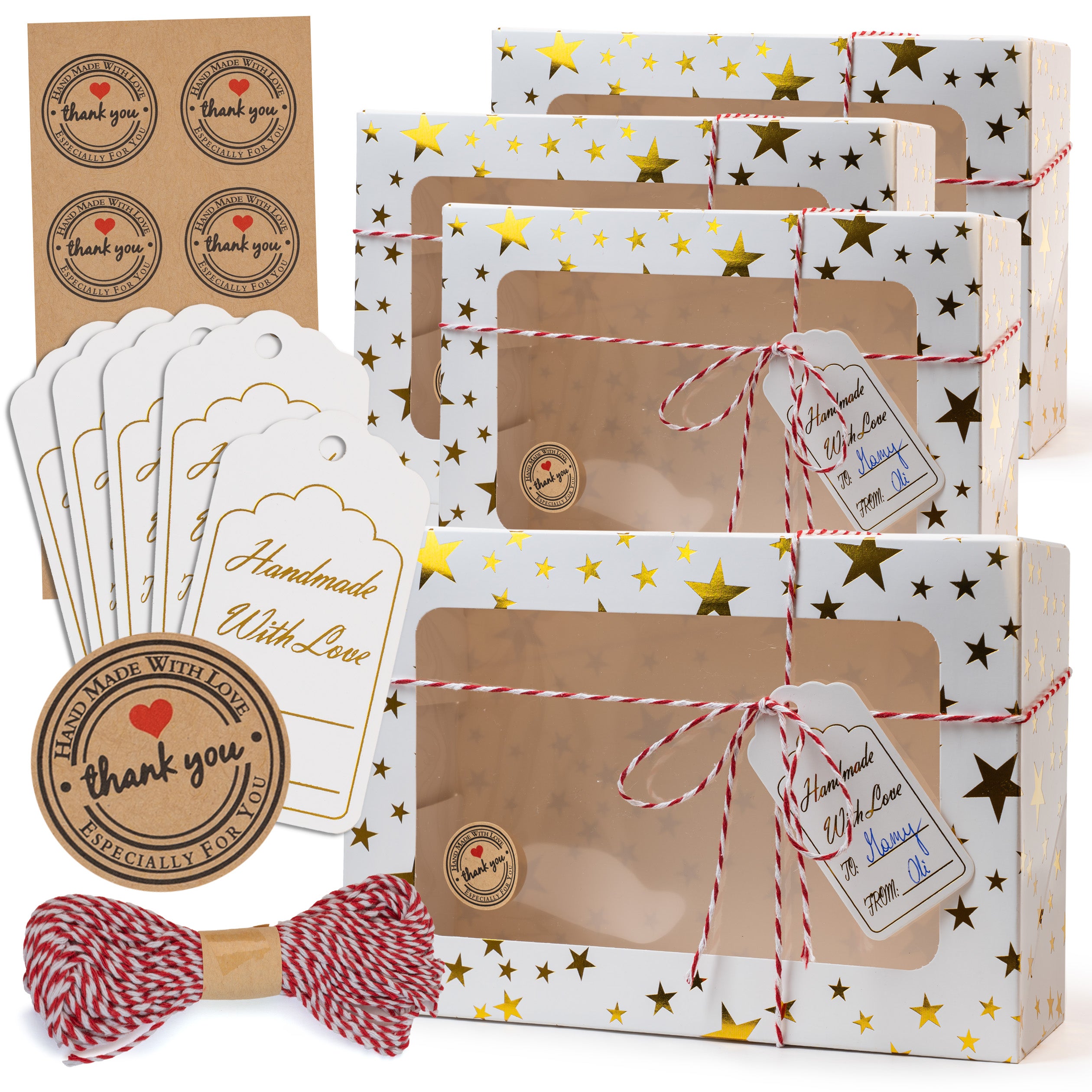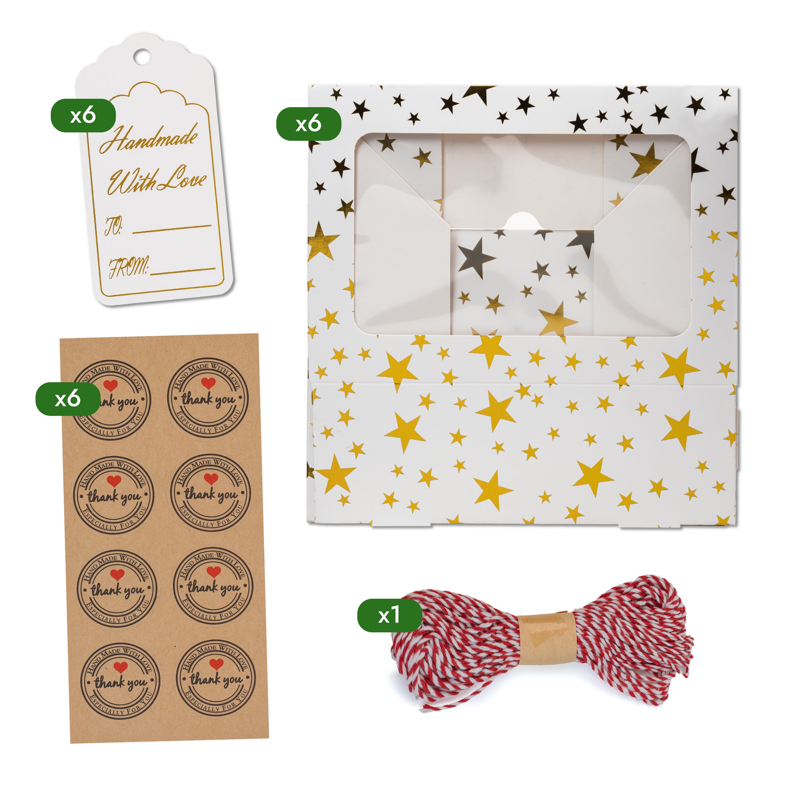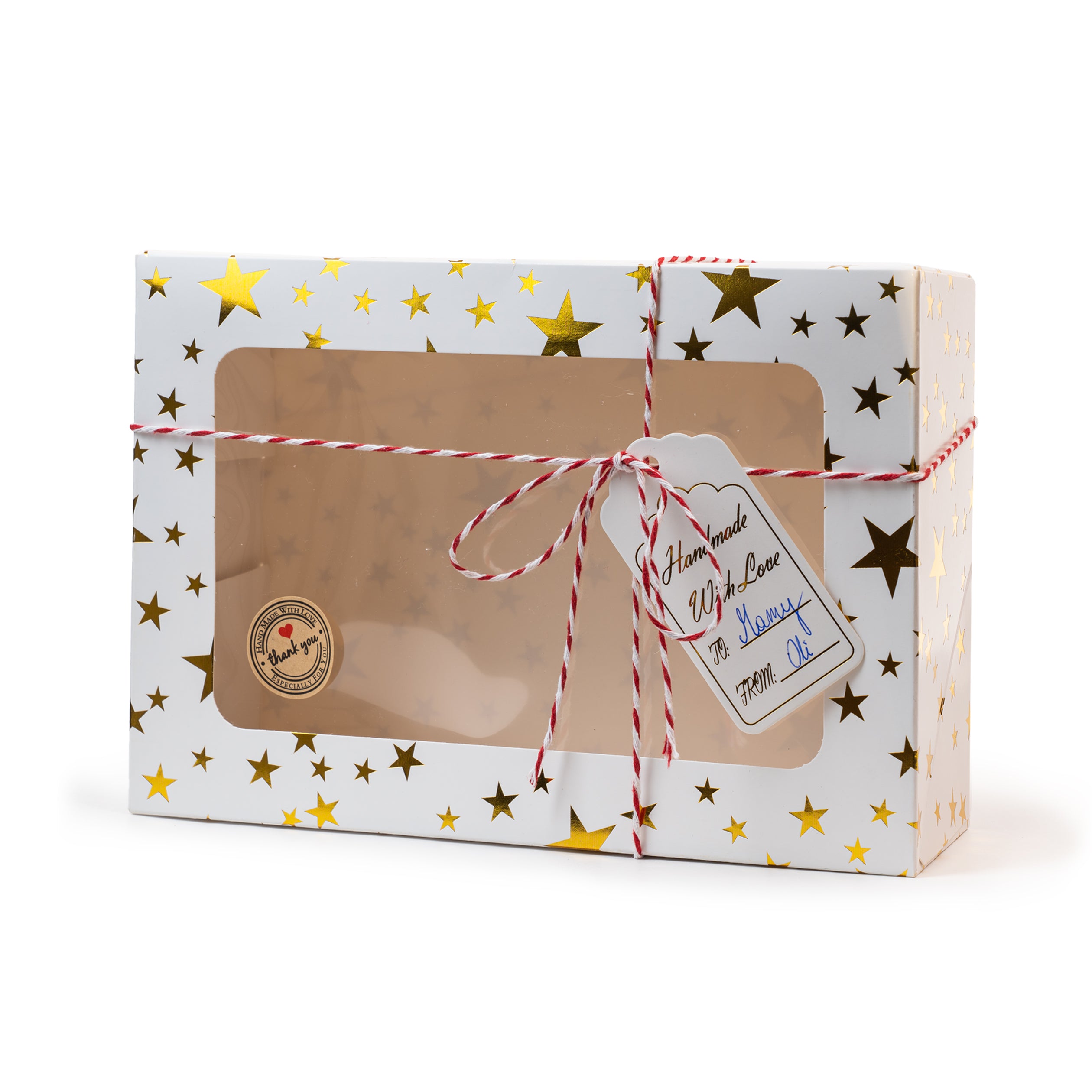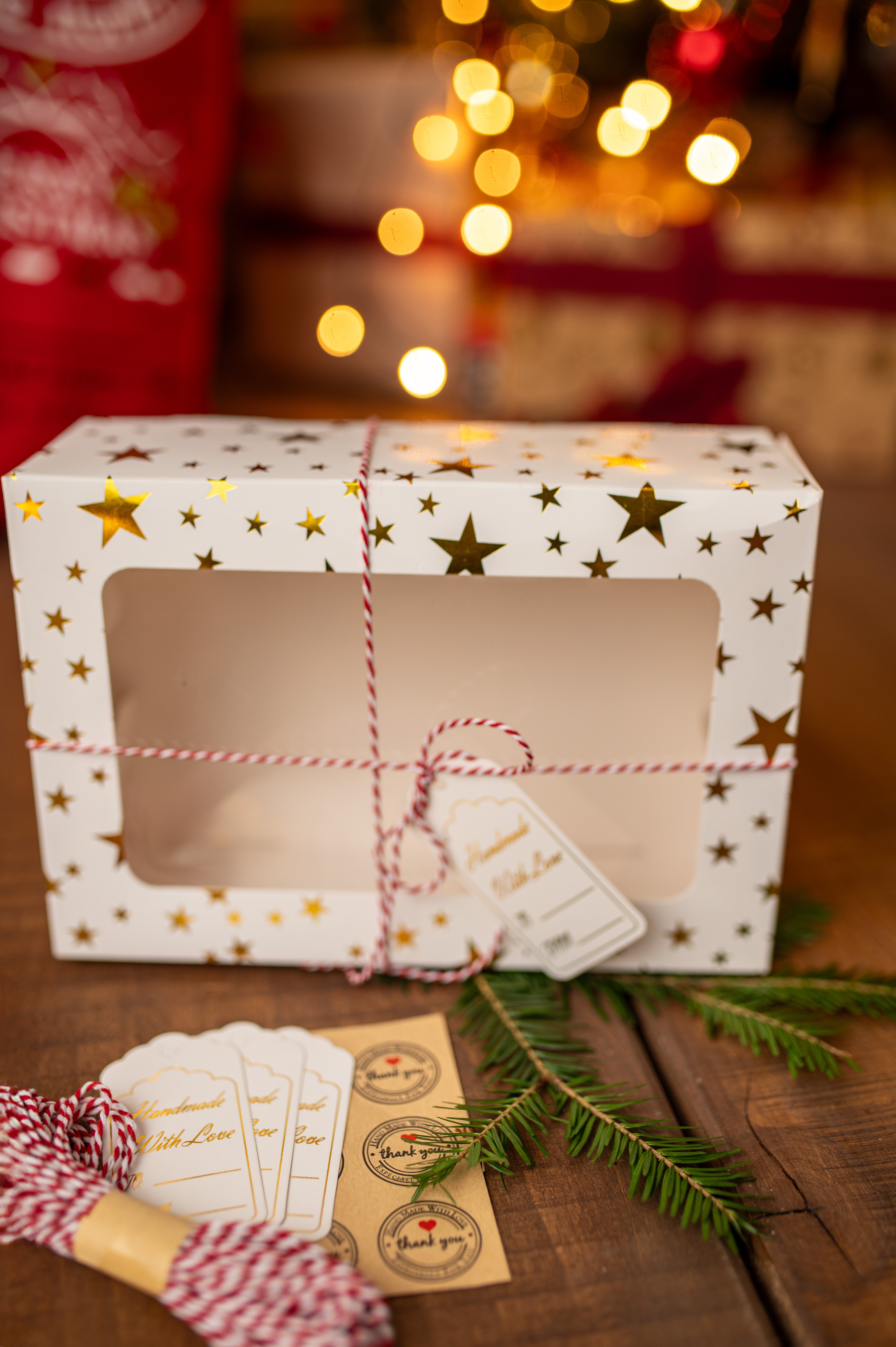 Dieses Set mit 6 Geschenkboxen mit Sichtfenster ist eine elegante und praktische Lösung zum Verpacken von Backwaren, Geschenken oder Festtagssets. Jede Schachtel ist aus stabilem, weißem Papier gefertigt und mit goldenen Sternen verziert, was ihr einen einzigartigen, festlichen Charakter verleiht. Durch das transparente Sichtfenster lässt sich der Inhalt ansprechend präsentieren, und das einfache Faltsystem ermöglicht eine schnelle Geschenkverpackung ganz ohne Klebstoff.