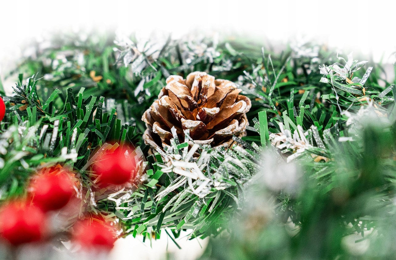 - Verziert mit Tannenzapfen mit weißen Akzenten und roten Vogelbeeren.