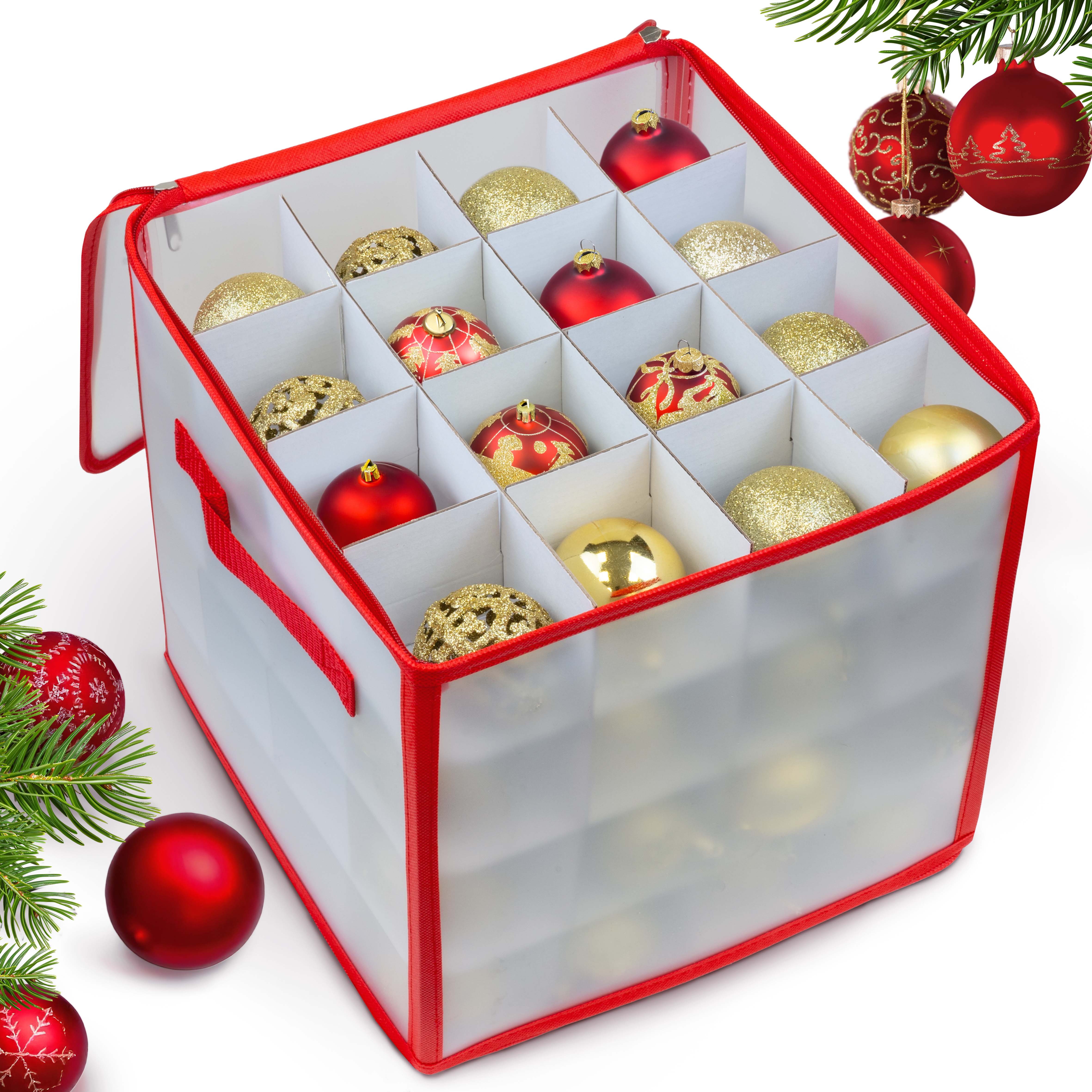 Die 64-teilige Weihnachtskugeltasche ist eine praktische und ästhetische Lösung für alle, die ihren Christbaumschmuck pflegen möchten. Dank der Fächer hat jede Kugel ihren eigenen Platz und die solide Konstruktion sowie der verschließbare Deckel garantieren Schutz vor Staub und Beschädigung.