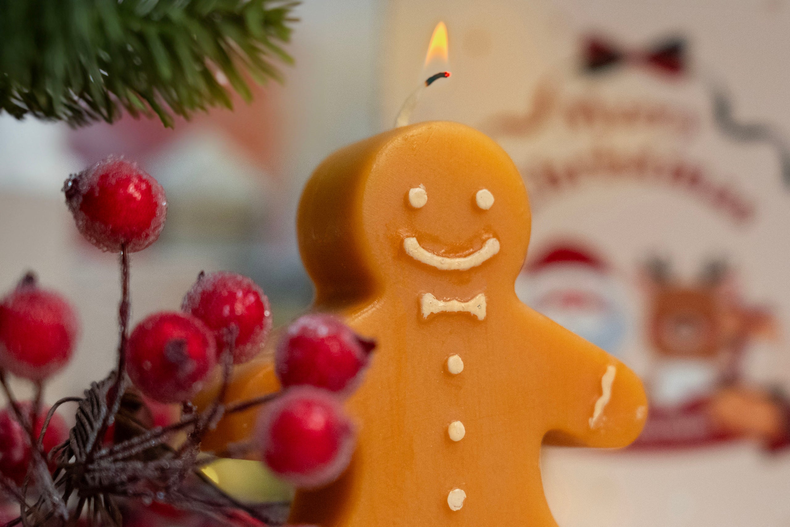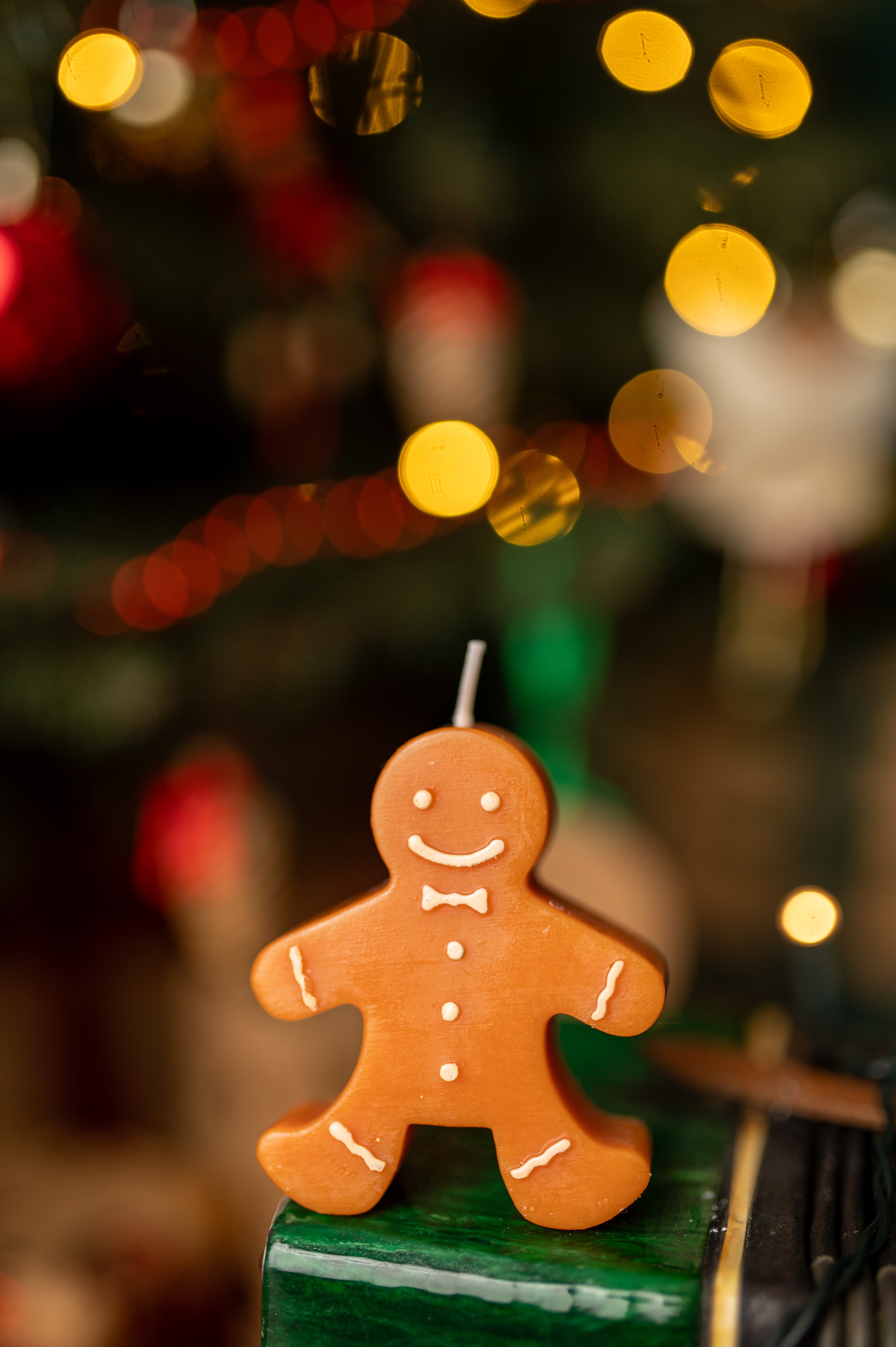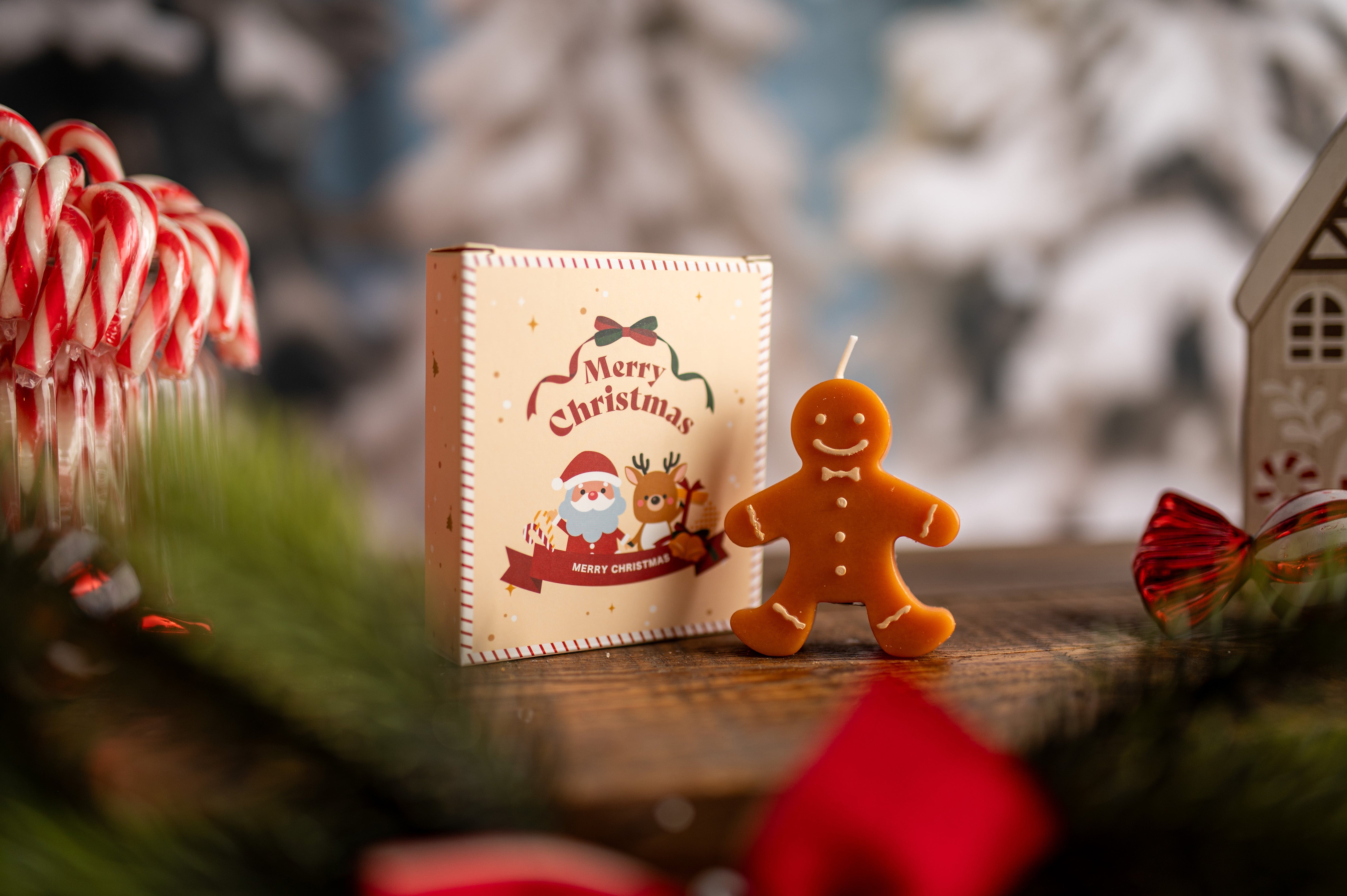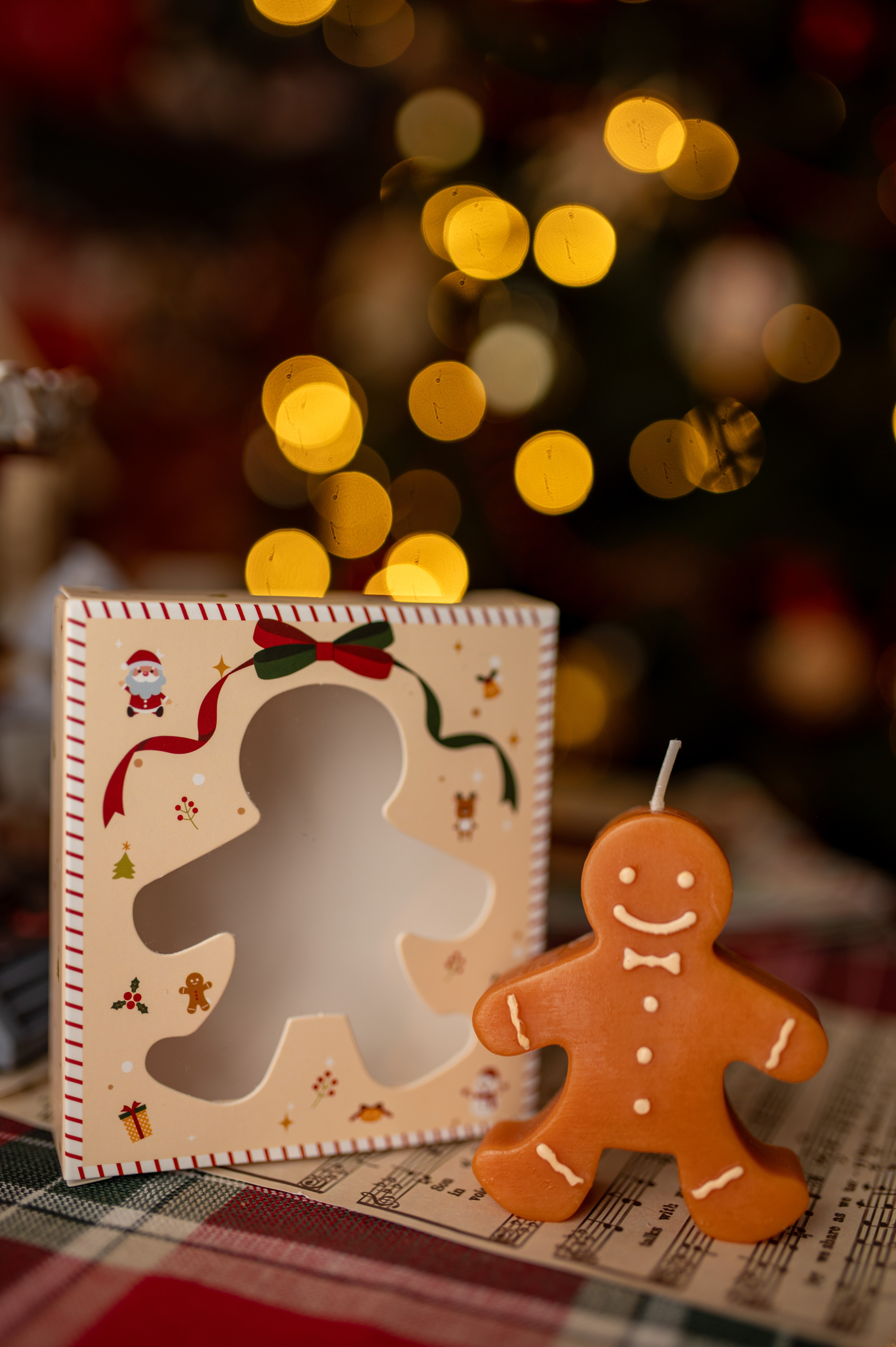 - Eine bezaubernde Kerze mit weihnachtlichem Thema – erhältlich in den Varianten: Lebkuchenmann, Weihnachtsbaum oder Schneemann.