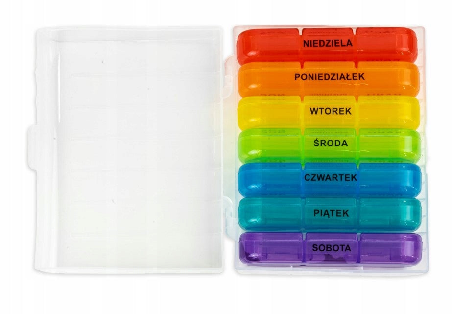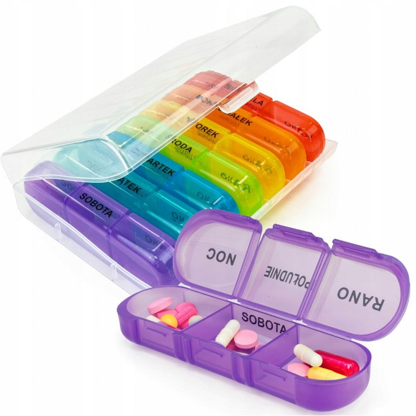 Wochen-Medikamentenplaner für 7 Tage x 3 TageszeitenFarbenfrohe Tablettenhülle mit polnischen Etiketten erleichtert die regelmäßige Dosierung und Organisation Ihrer Medikamente!